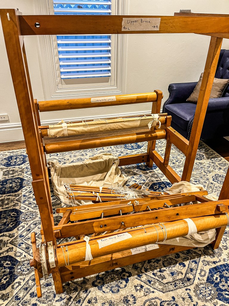I made sure to capture a comprehensive set of pictures at the seller’s house before disassembling the loom. Recognizing the complexity of the task, I aimed to document every detail, ensuring a smooth reassembly process later on. The seller thoughtfully labeled each part and secured the lams, simplifying the reattachment process. However, the journey home was not without its challenges—some pegs dislodged during transport, necessitating careful rethreading upon my arrival.